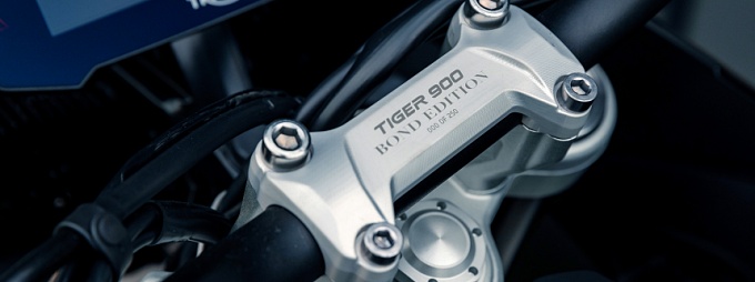 Zusätzlich wird mit jedem Motorrad eine unterzeichnete Echtheitsurkunde von TRIUMPH mitgeliefert. Abgerundet wird das Design der Bond-Edition durch zahlreiche schwarze Stilelemente: Rahmen, Einfassung der Scheinwerfer, Seitenverkleidungen, Ölwannenschutz, Halter der Soziusfußrasten sowie Abdeckungen der Zusatzscheinwerfer und des Motorschutzes sind gentlemanlike im hochwertigen schwarzen Finish ausgeführt.