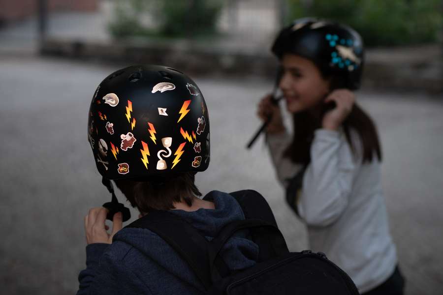 In der Morgendämmerung helfen Helmsticker, Kinder im Verkehr sichtbarer zu machen. |